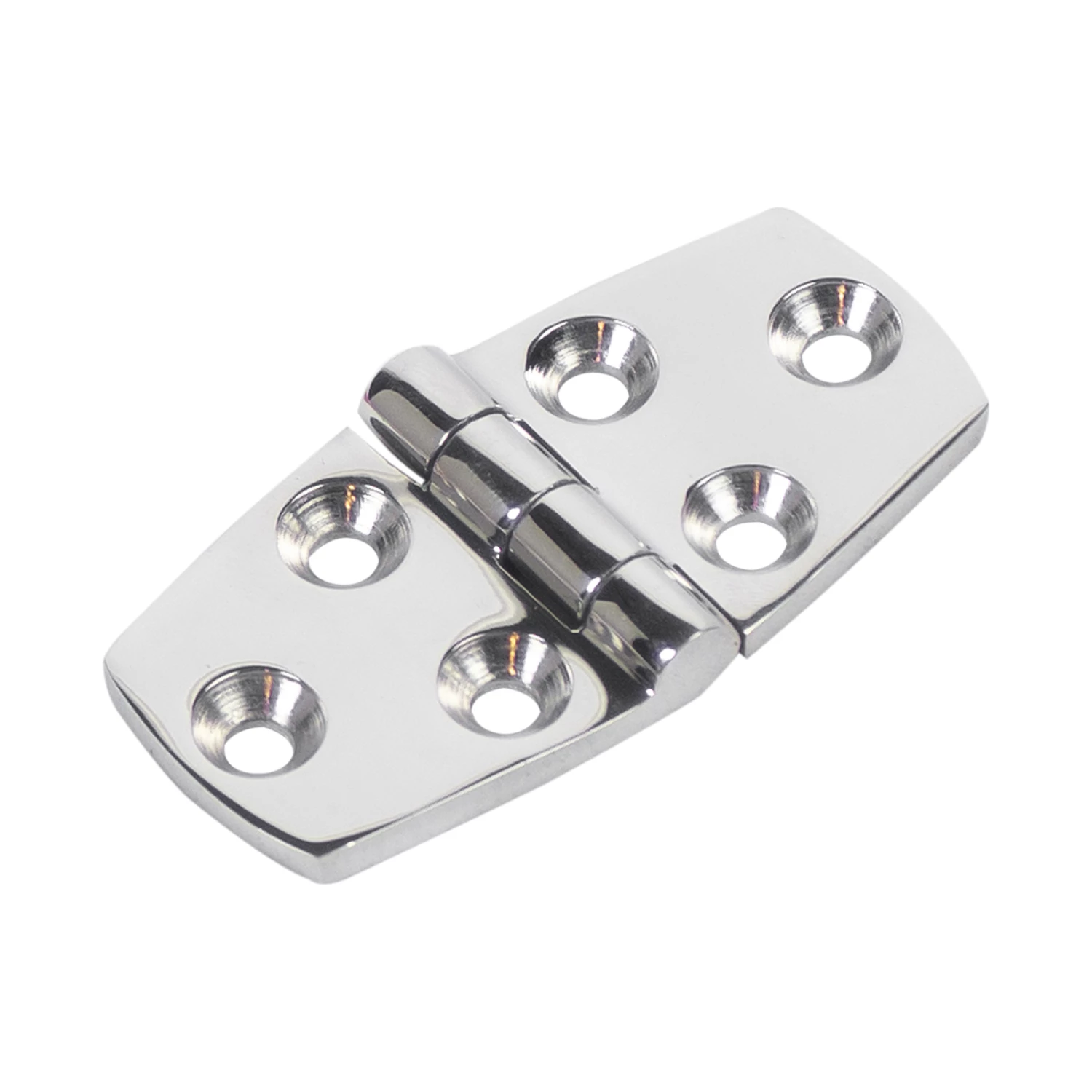 Small stainless steel uneven hinge. Ideal for both indoor and outdoor applications. Polished stainless steel finish. Corrosion resistant and easy to install.