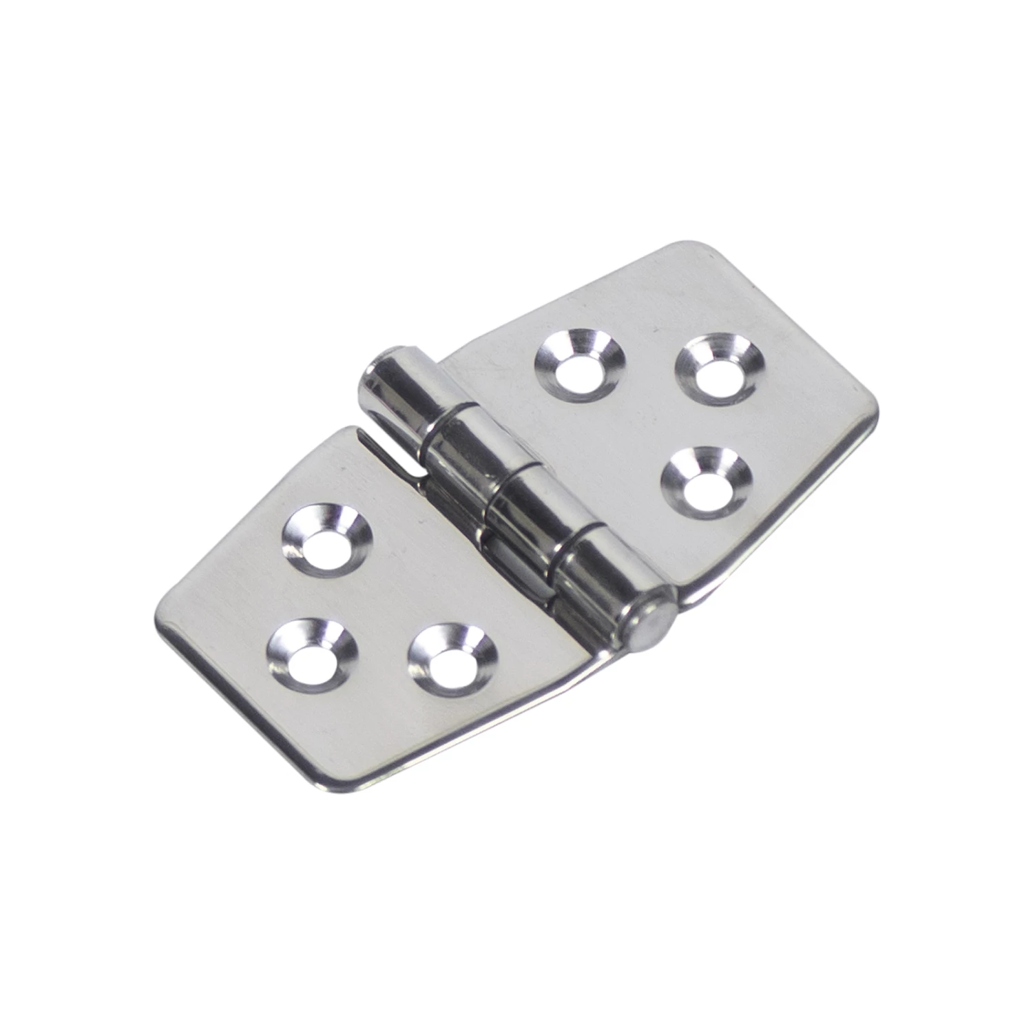 Small stainless steel hinge. Ideal for both indoor and outdoor applications. Polished stainless steel finish. Corrosion resistant and easy to install.
